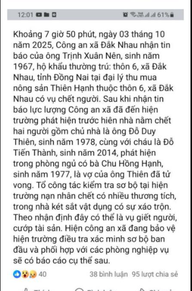 Hiện công an đang phong toả hiện trường, khám nghiệm và điều tra.