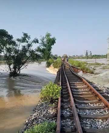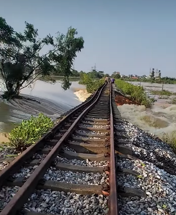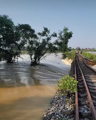 Theo một số tài khoản trên MXH chia sẻ, nước lũ đang đổ về cuồn cuộn tại Đường tàu tại xã Trung Giã – Sóc Sơn cũ – Hà Nội.