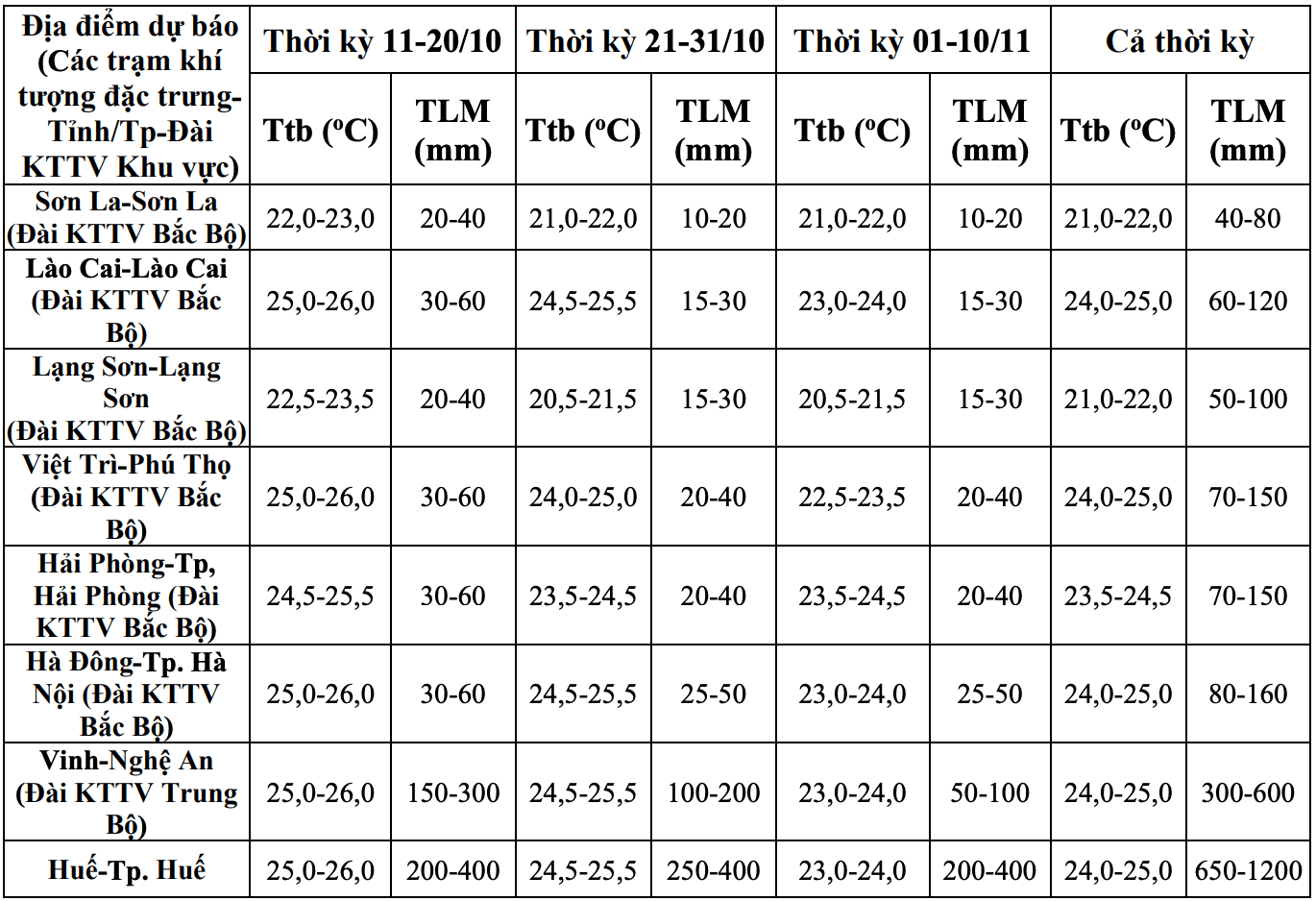 Thời kỳ từ nay đến ngày 10.11, dự báo có khả năng xuất hiện mưa lớn diện rộng trong thời kỳ đầu tại khu vực Bắc Bộ và các tỉnh Thanh Hóa, Nghệ An. Các tỉnh từ Hà Tĩnh đến Quảng Ngãi có khả năng xuất hiện một số đợt mưa lớn diện rộng. Các khu vực khác có nhiều ngày có mưa rào và dông; trong đó, một số ngày có thể xảy ra mưa vừa, mưa to.