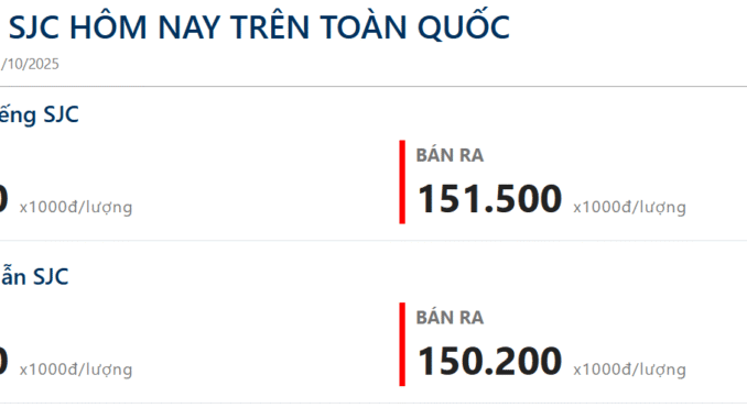 Cập nhật sáng 21/10 của PV Dân Việt, giá vàng hôm nay SJC giao dịch ở mức 150,5 – 151,5 triệu đồng/lượng mua – bán, không biến động so với chiều qua. Đây cũng là giá mua – bán tại các thương hiệu khác như DOJI, PNJ… Chênh lệch mua vào – bán ra duy trì ở ngưỡng 1,5 triệu đồng/lượng.