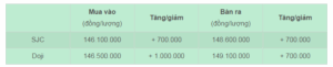 Còn giá vàng nhẫn 9999 tại Doji tăng 1 triệu đồng/lượng ở chiều mua vào và đắt hơn 700.000 đồng/lượng ở chiều bán ra so với kết phiên giao dịch hôm qua, giao dịch ở mức 146,5-149,1 triệu đồng/lượng (mua – bán).