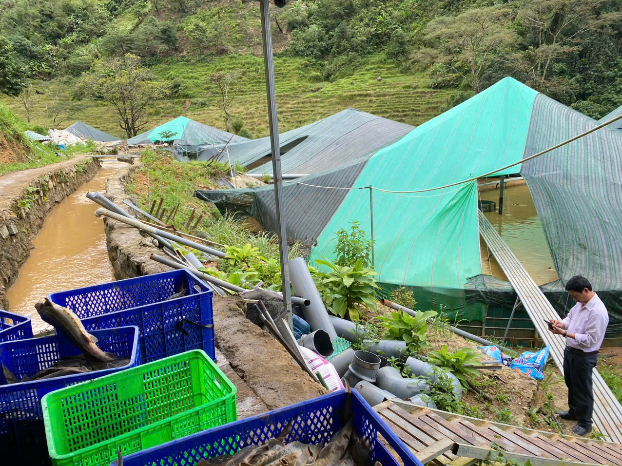 Khu vực nuôi cá tầm bị nước, đất đỏ từ vụ sạt lở tràn xuống khiến cá chết hàng loạt